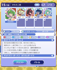 はーい、みにっくです♪今日少し掲示板で話題に出ました上方修正されたローザッテは強いのかについて書いていきます(^◇^)の前にちょこっと挟みますが、特盛後のローザッテさんカッコ良すぎないですか・・・☆さて、本題に戻りますが、結論強いです。いわゆる条件エンハンスですね♪ただ、ライバルの筆頭として今配布されているいきなり探偵プーボ&ゼロも同じスキルです、そんで持って倍率はプーボゼロの方が高いです(コスト違うので当たり前ですが・・・)。でも、ここで注目したいのはローザッテさんが黄色属性だということ。この前のギルイベの時にスキル砲について話しまして、低資産だと黄色が空きがちという発見をしました。ここにザッテさんを組み込むことで全色揃い、ギルイベがサクサクいけます!!!これは私も多用しそうです、ザッテさんよろしくお願いしまう♪ギルイベスキル砲低資産おすすめ構築載せておきますね!!(ザッテさん星6なのは見なかったことに・・・、ついでにプラス振り雑だということも見なかったことに・・・)