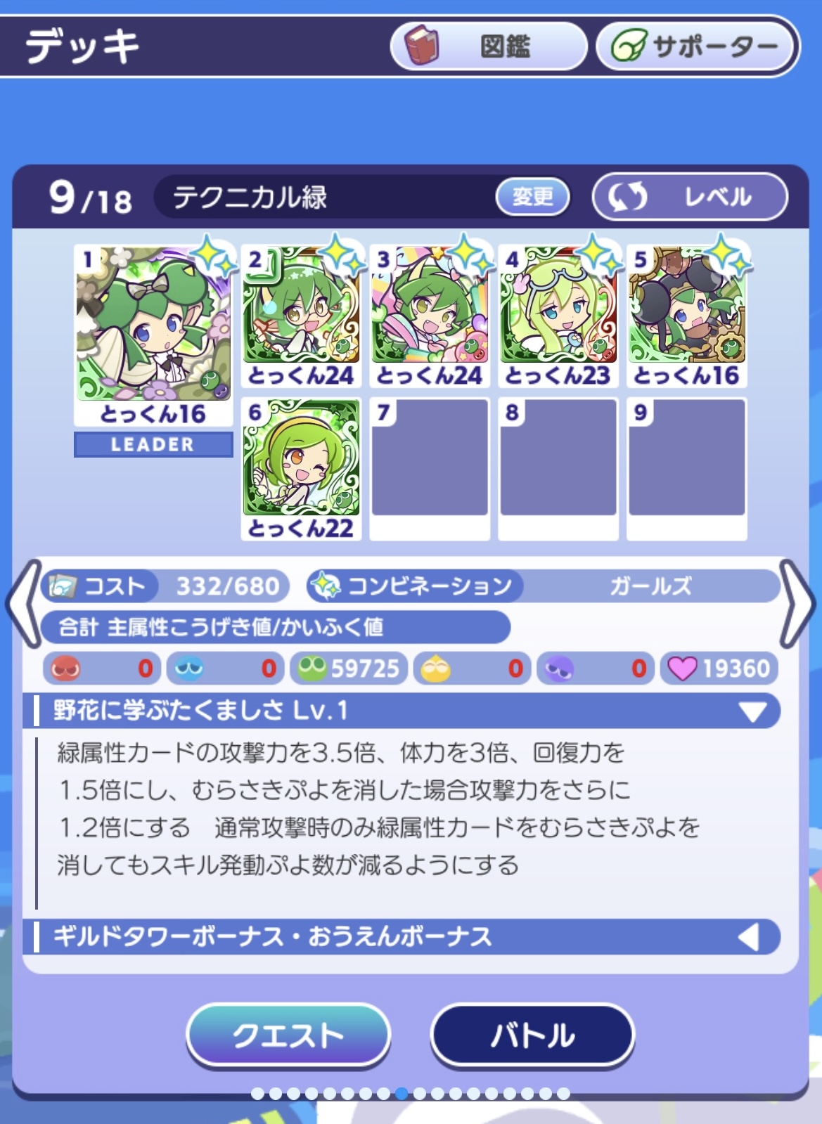青登りました!みにっくです♪最近は朝と夜の2回しかぷよクエin出来てません( i _ i )ごめんなさいです・・・。プリンプほんとにまずいですが、まあいっかって感じです笑笑さてさて、とことん塔青も無事クリアしました!!クリア画面撮り忘れたのでパーティだけ貼っておきます!なんのガチャで出たか忘れましたが、ずっと欲しいなぁと思っていたはなののリデルがたまたま手に入ったのでスムーズなクリアが実現しました(^◇^)ただ、青に加え緑も攻撃減少解除もってなんですよ〜( ; ; )普通に欲しいです笑笑12周年の配布キャラでぜひお願いします!!!笑笑