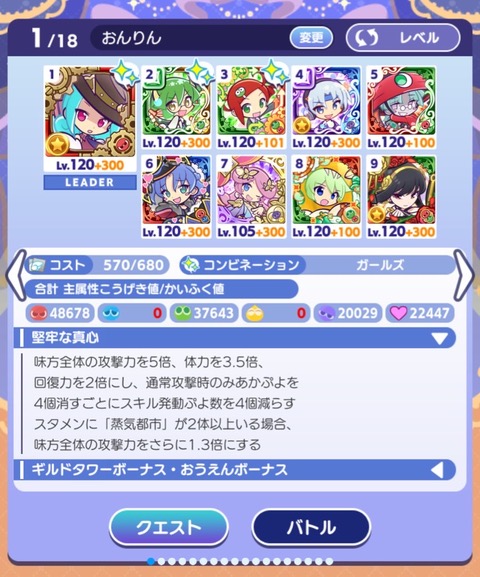 スライドしましたよ、一応笑笑10何回か挑戦して一回だけ成功しました!!はい、最初の一回です笑笑今回かなりかなり難しくて、バリアでターン稼いでとか色々考えましたが、私には無理でした。多分、双剣シェゾが必須でしたかね。ってことで私のパーティはこちらです。使い方は簡単、爆速でスキルを貯めるだけです笑笑これ2周目まで行くのはかなりの資産が必要かと思います!!はい、このデッキ、イッチバン難しいのが3ターン目です。3ターン目の攻撃を耐えられるかどうかが最大の肝です。2ターン目にドラコのスキルが貯まれば、使えば耐えられるのですが多分使うと間に合いません。幾星シェゾの体力が心もとないんですよね、だから、大連鎖チャンスやハートボックスで結構大量に回復しなきゃいけません。お邪魔ぷよが大量に来るので結構至難の業ですこれが。はい、3ターン目までに表のスキルを全員溜めます。一見難しくなさそうですが、お邪魔ぷよが大量にあるのでだいぶむずいです。赤ぷよを消せばスキル7個減るので、困ったら赤ぷよです。そして4ターン目にスライド、オンりんを使って爆速でスキルを貯めつつお邪魔ぷよを全消ししていきます。ここもむずいです。リーダーにスキル加速がないのでうまくチャンスぷよを作っていきたいのですが、お邪魔ぷよがその名の通り邪魔すぎです。7ターン目までに全員スキル貯めれば全員使っておしまいです。やはり3ターン目の攻撃を耐えるのがかなり難しいです。ちなみに62兆でしたね、それでは明日は収集やります笑笑