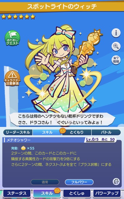 お疲れ様です!では残りの子たちの話の話をしていきますか。まずはドラコ。この子が現状一番不遇かもしれないです・・・。一言で言うと泡沫フェーリの下位互換ですかね。でも与ダメ強キャラ持っていなくて、特殊状態付与キャラが他にいない方は役に立つと思います。資産と相談ですね。次にウィッチです。おそらく現状一番活躍しているのがスポットライトウィッチですかね!隣接エンハ+ネクストプラス化です!このネクストプラス化で強力なバフキャラは黄色ではこの子しかいないんですよね。だから、来たる黄色新アタッカーの相方になる可能性が極めて高いです。新アタッカーがもし黄色紫だった場合はレミちゃんと枠を争うことになるんですかね。黄色赤ってことはないと思いますが、それだとぶっ壊れちゃうので・・・。最後シェゾ、属性被ダメっすね。他に紫の属性被ダメを持っている方はいらないでしょう、完全下位互換なので。持ってない方は優先順位高めな気がします。こんな感じで、スポットライトは本当に持っているキャラと相談って感じですね~みなさん何が手に入ったのでしょうか???