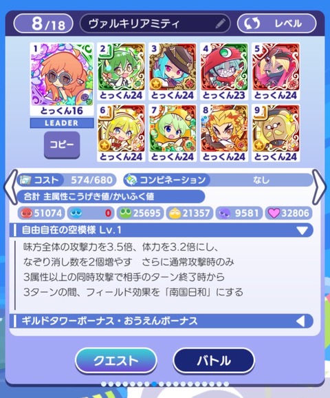 お疲れ様です~!!!今日はスライドデッキの話をしますかね。はい、8回スライドしました笑笑敵、とてつもなく殺意強いです笑笑童磨並に笑笑今日も鬼滅見てきまして、もう感動感動で、って話を戻します笑そうなんですよ、もう晴れにしたりバリア貼ったりをしまくらないとお陀仏様です・・・。はい、1→2→3→4→3→9→1→4→8です、なっゲー笑笑全集中でなんとかなんとかやってます笑笑もうスキル使う順番とかもめちゃくちゃ大変で成功率は10回に1回くらいです笑笑そんでそっから運ゲーがあります。盤面に赤ぷよが5個残らなきゃいけないのですお邪魔ぷよの後に。これの成功率が結構低いんですね笑笑ハーピー持ってる方は絶対そっちを使った方がいいっすね笑笑