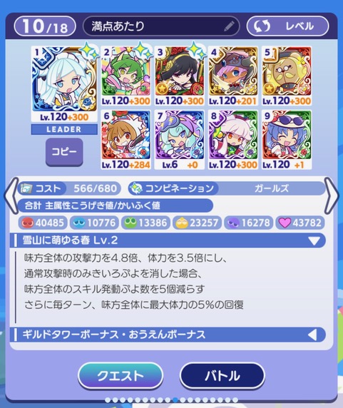 お疲れ様です~!!今日は何話そうかなと思っていたのですが、ギルイベ用に作ったデッキで紹介していない(気がする)やつ見つけたのでここで紹介して、崩そうと思います!!笑笑かなり出来がいいと思いまして、多分次も使うと思います。回復もりもりパーティです♪ヌールとスノ姫がチャンスぷよを作ってくれて、リスクまがなぞり消し増やしてくれて、イバラ姫でタフネスがあってとかなり完成しているパーティのように思っています!スノ姫、リスクま、イバラ姫はギルイベ大活躍です♪